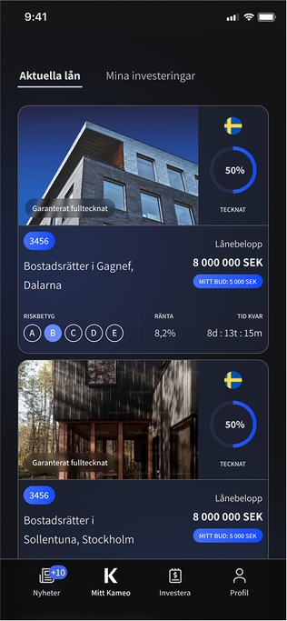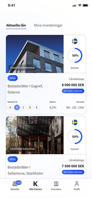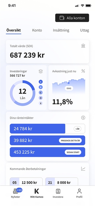 Kameo is an investment platform that enables both private individuals and institutional investors to invest in loans for real estate projects across Scandinavia. Through the platform, property developers gain access to fast and flexible financing, while investors receive monthly interest payments until the loan is fully repaid.