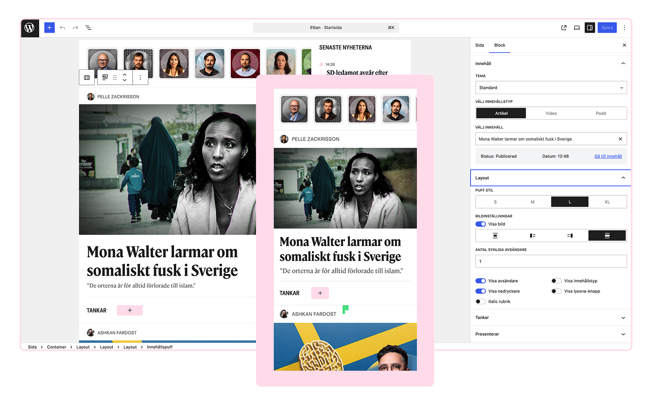 Kvartal now consists of two applications, a website and a mobile app, which are both managed through a single system. A key goal of the new platform was to provide editors with a simple, efficient working environment while maintaining the flexibility required by different content types.