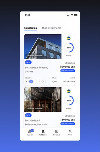 In 2025, we launched a new app for Kameo, a platform where private and institutional investors can invest in loans for real estate projects across Scandinavia. Our team was responsible for both design and development, working closely with Kameo’s product owner, CTO, and Head of Marketing.